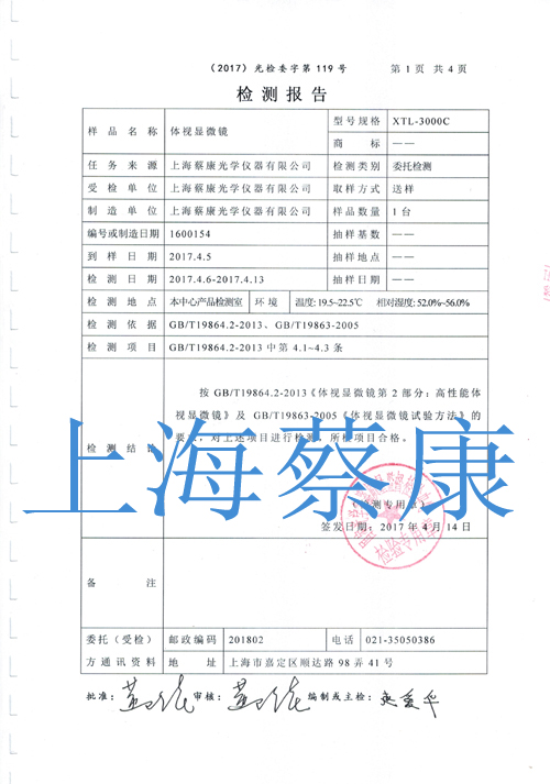 • 體視顯微鏡國家光學檢驗中心檢測報告