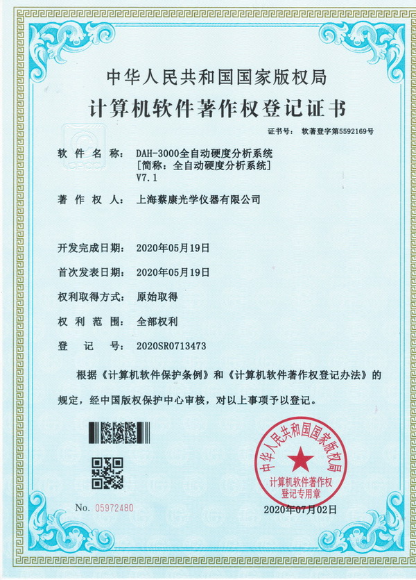 • 硬度分析軟件著作權證書